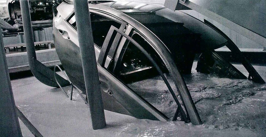 The assembled car goes to the quality control station for a check of tire geometry, the braking system and headlight adjustment. The car undergoes a separate waterproofing test.