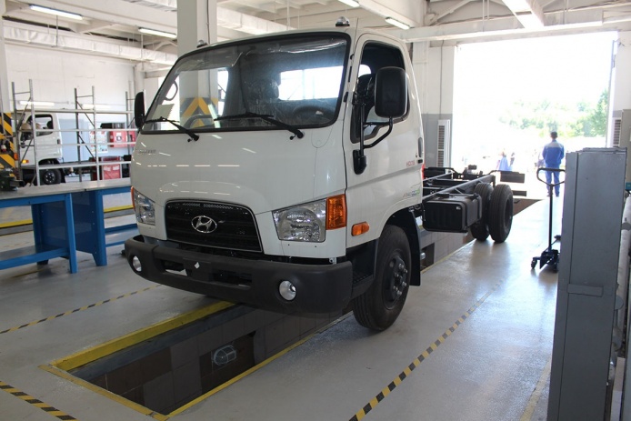 There are three stations where repair can be carried out simulataneously. As it was noted during the tour, the auto assembly plant has qualified staff, extensive expertise, and all necessary equipment recommended by Hyundai Motor Company (HMC). Besides maintenance which includes repair, diagnostics, replacement of engines for a similar engine, installation of gearbox and clutch, replacement of cabins, repair and replacement of electrical equipment and wiring, technical assistance, tire fitting and many other types of services, maintenance and repair of special vehicles as well as installation of additional equipment are carried out here.