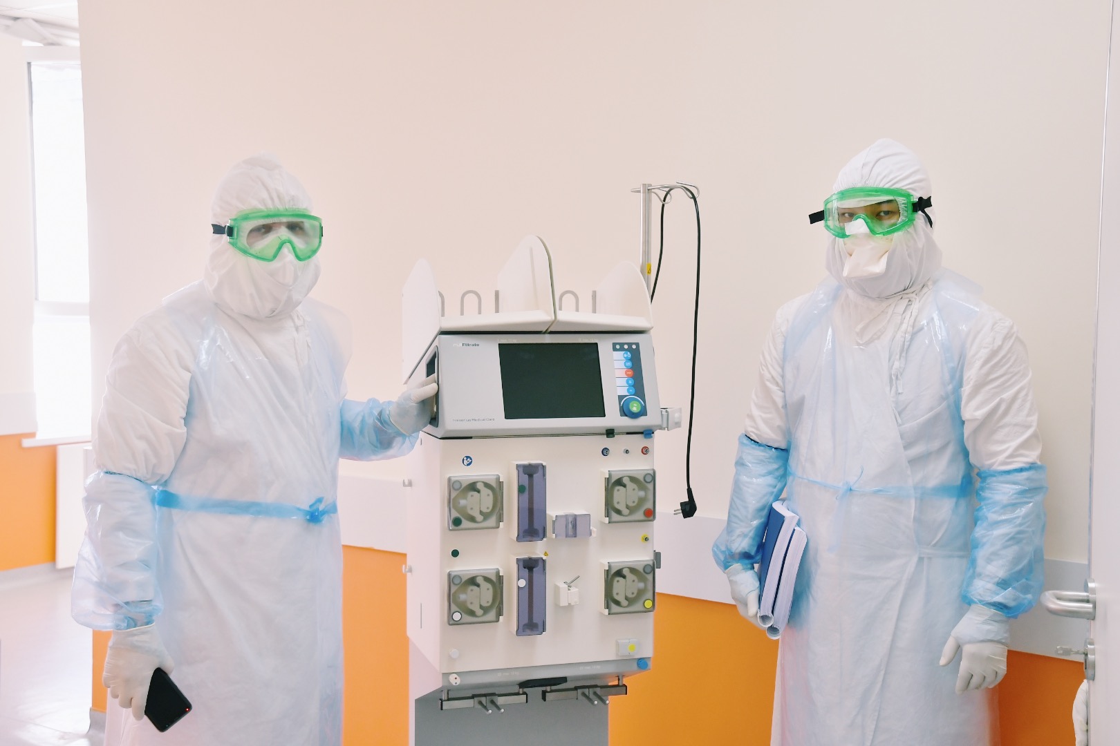 Астанамыздың жұқпалы аурулар орталығында қазақстандық инфекционистер, пульмонологтар, реаниматологтар, компьютерлік, функционалдық диагностика дәрігерлері, жалпы есеппен 90 дәрігер науқас адамдардың өмірін сақтап қалу үшін күресуде. Жабдықты тапсыру күнінде госпиталь мамандары науқастарды жедел гемодиализге арналған жаңа аппараттарға қосты.