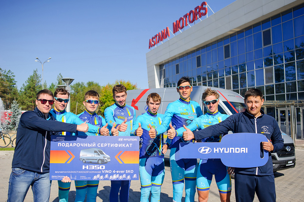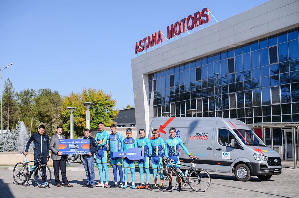 В октябре этого года "Астана Моторс" вручила молодой континентальной команде подарок —автомобиль Hyundai H350, собранный на автосборочном предприятии компании для нужд команды. Этот автомобиль будет вывозить на соревнования командные велосипеды и прочую технику и оборудование, а механики смогут с удобством их обслуживать.