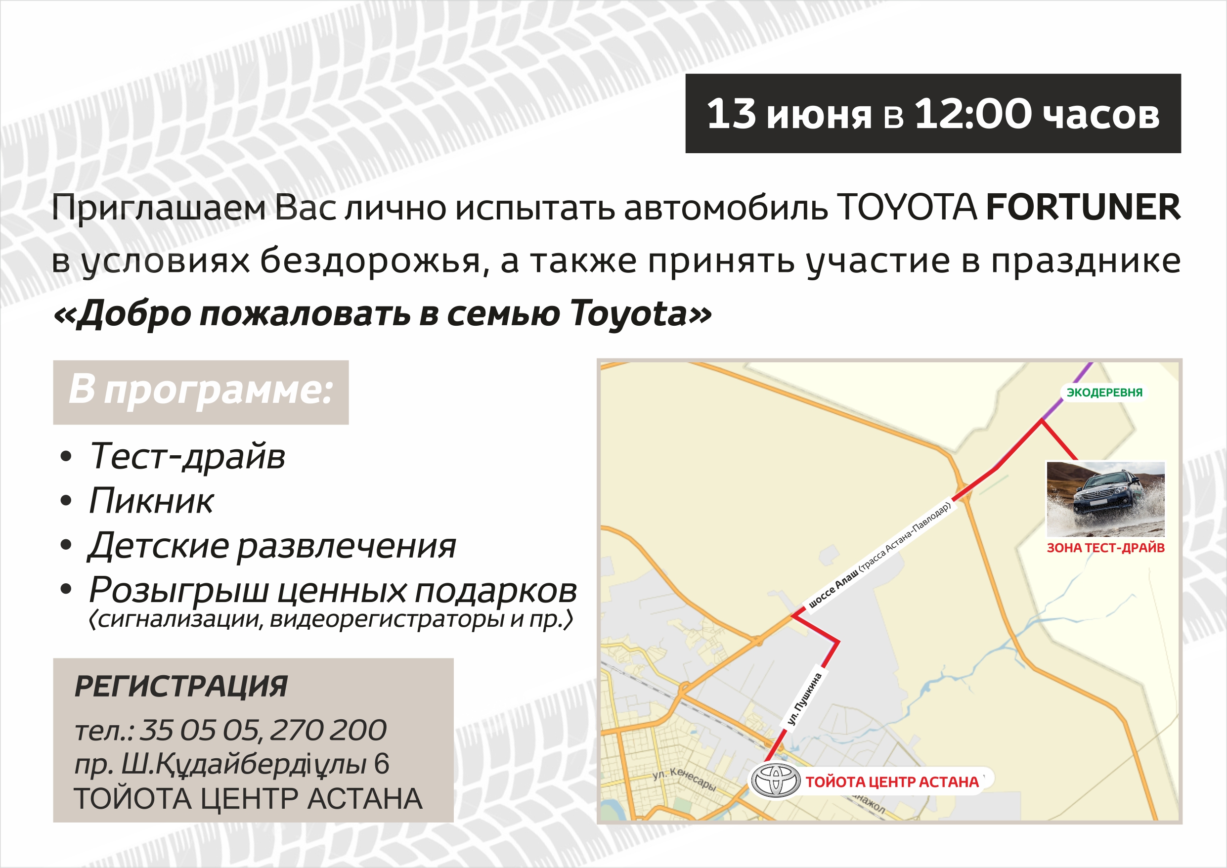 У вас есть шанс испытать первую модель Toyota казахстанского производства в условиях бездорожья, а также принять участие в празднике "Добро пожаловать в семью Toyota".