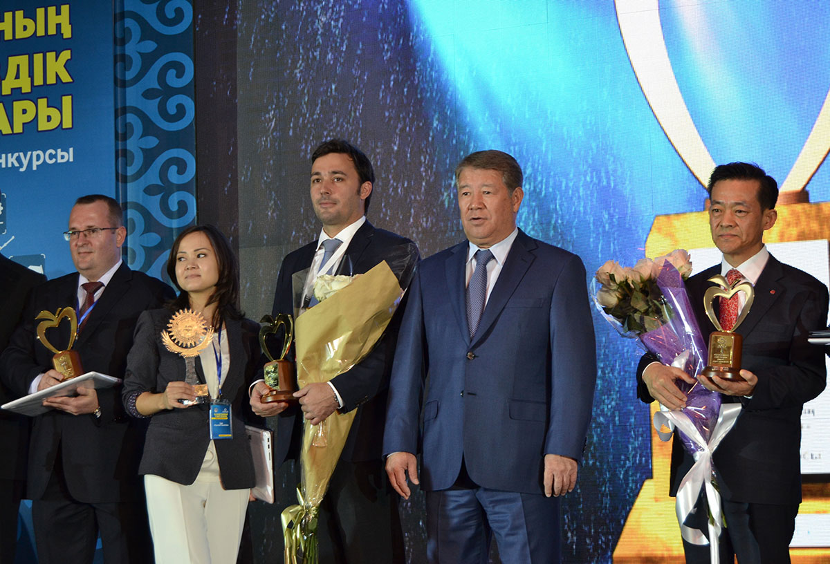 Приз из рук акима города Алматы Ахметжана Есимова и заместитель председателя правления Национальной палаты предпринимателей "Атамекен" Гульнар Курбанбаевой получил исполнительный директор КМК "Астана Моторс" Антон Афонин.
